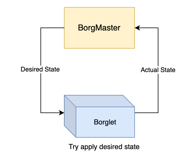 BorgMaster gửi trạng thái mong muốn xuống Borglet (ví dụ chạy một job hello_world) => Borglet áp dụng trạng thái mong muốn đó lên máy chủ của mình => Borglet báo cáo lại trạng thái hiện tại của nó cho BorgMaster => BorgMaster so sánh với trạng thái mong muốn hiện tại trong Paxos store, tính toán các điểm khác biệt, và lặp lại chu trình này.