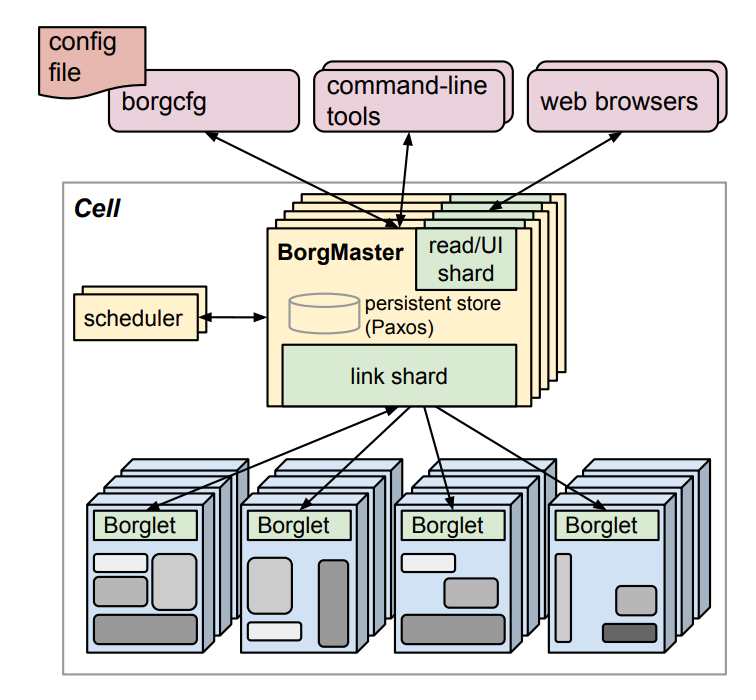 Mỗi cụm máy chủ được gọi là 1 cell, mỗi cell có ~10000 máy chủ, gồm có 2 thành phần chính: BorgMaster và Borglet